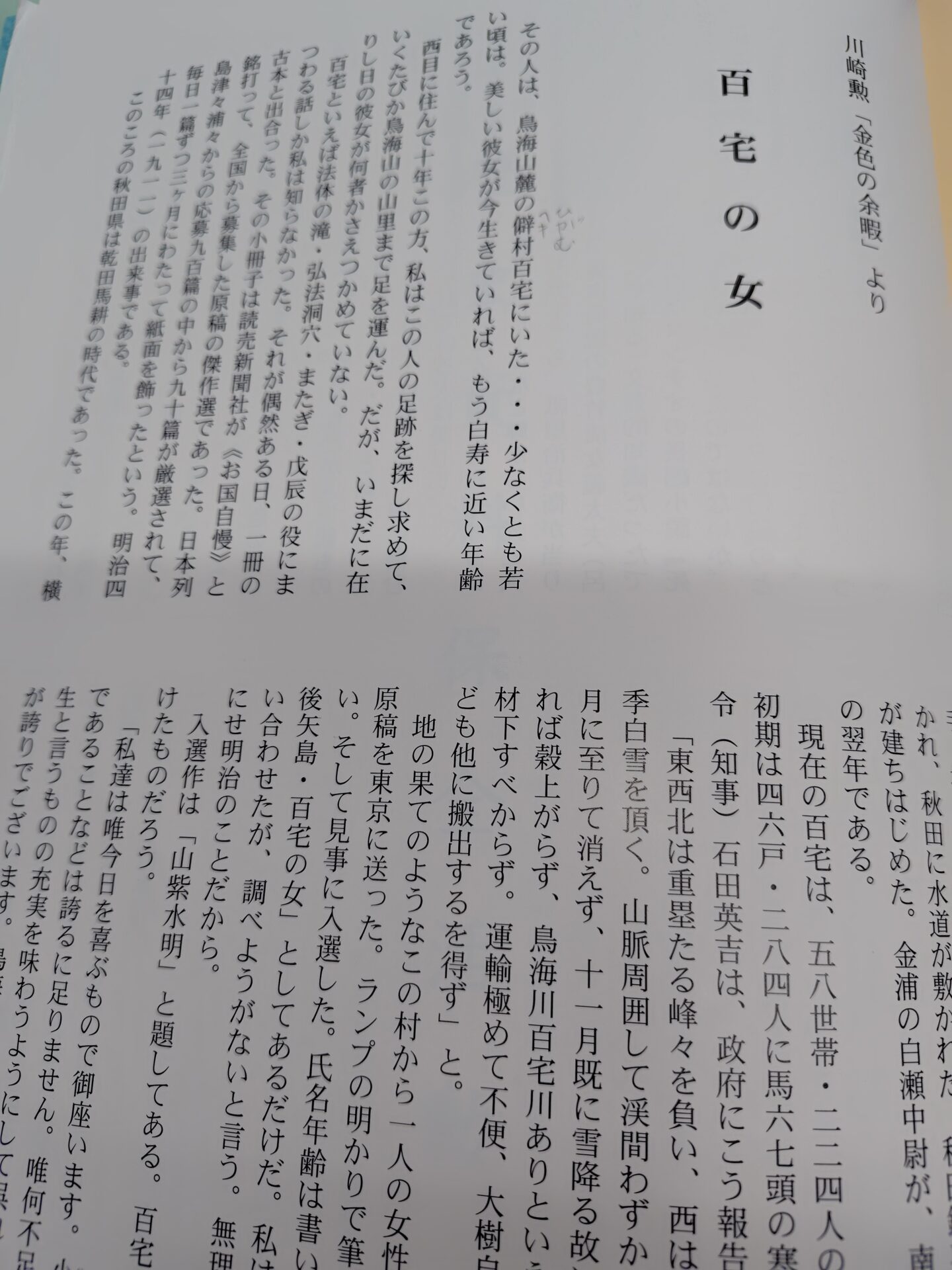 私も本文にはとても感銘を受けました。そしてこれを紹介された川崎勲さんの解説もまた、「私も是非彼女に逢ってみたい!」と思わせる内容でした。小野小町の後裔としての誇りよりも尚、美しい百宅の山紫水明をあのように表現できるなんて。私からすれば、この「百宅の女(ひと)」こそ小野小町の血族ではないのかと思いました。