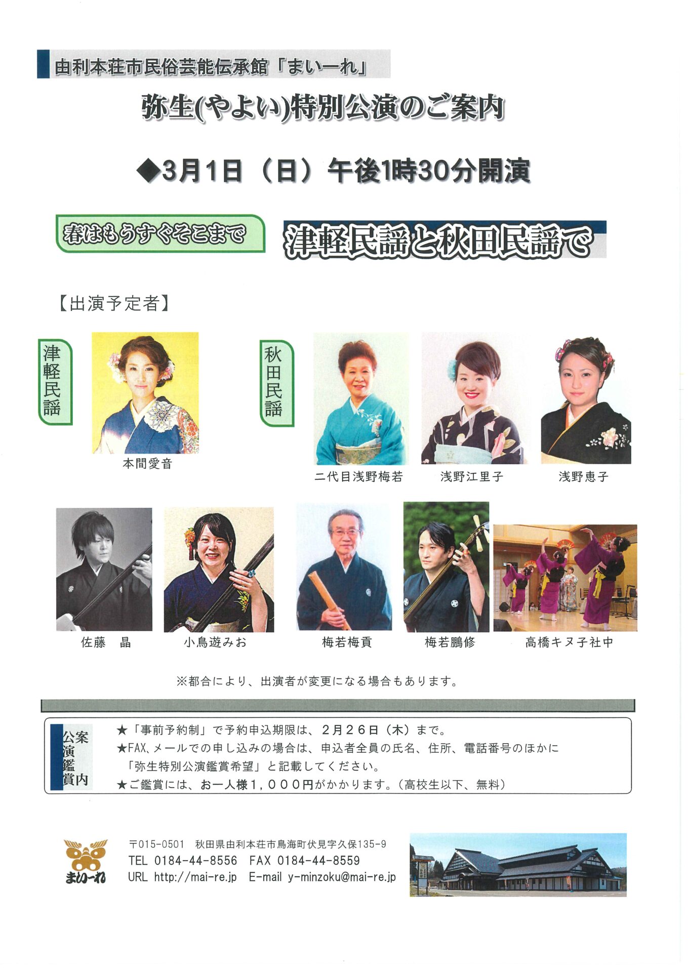 冬将軍の到来に恐々たる毎日ですが、除雪作業の皆様に敬意と感謝を申し上げます。2ヶ月後の春を待ちわびながら「弥生特別公演」のご案内を致します。皆様お誘い合わせの上お出で下さいますようお待ち致しております。